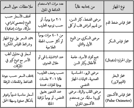 تشمل الأجهزة الطبية المنزلية الشائعة أجهزة قياس الضغط، أجهزة قياس السكر، ميزان الحرارة، أجهزة البخار (النيبولايزر)، وأجهزة قياس الأكسجين (نبض الأكسجين). توفر هذه الأجهزة مراقبة مستمرة لحالة المريض الصحية دون الحاجة لزيارة المستشفى في كل مرة، مما يحسن المتابعة ويقلل من المضاعفات. يبين الجدول التالي نوع الجهاز، ومن هم الأشخاص الذين قد يحتاجونه غالباً وعدد مرات الاستخدام وملاحظات حول السعر: