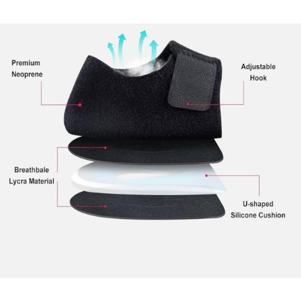 - الدعم والضغط: يوفر المشد ضغطًا لطيفًا ومحددًا على منطقة الكعب والقوس، مما يدعم اللفافة الأخمصية ويقلل من الضغط عليها أثناء المشي أو الوقوف.